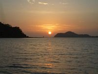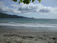 We went ashore early this morning and checked email, read the news and then went shopping. We discovered we can´t refill our propane tank here either so we will have to pay attention to how much propane we use over the next few weeks or we´ll be having no coffee for breakfast and that will be a total disaster! We got back to the beach will all our provisions and saw 3 foot breakers rolling into the beach and thought oh boy this is going to be fun! We dragged the dinghy down the beach to a slightly sheltered spot behind a boat anchored just offshore and watching the waves, went for it. Of course we got drenched and we ended up with a bucket of water over the bow of the dinghy but other than that our entry went very smoothly and we didn´t tip or do other odd maneouvers you often see cruisers do trying to get off the beach. The conditions were quite rough by now so we decided to up anchor and head around to Panama Beach which is far more sheltered. Just as we were leaving Playa del Coco we get a call on the VHF Radio from Yohela. They were about 15 miles out and would arrive in a few hours. We told them to head on around to Playa Panama as they will get a good night´s sleep and they did just that. We got tucked in behind the point and settled down to a relaxing drink on deck watching the sun sit behind King Kong Rock, which looks just like that giant gorilla´s head from here.