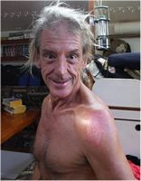Robin went walking today. He was going completely stir crazy being locked up on the boat out of any sun which could further damage his burns. Finally Michelle declared him fit enough to go as long as he stayed well covered. He almost walked on water he was so anxious to get ashore. Michelle tossed him in the dinghy and dumped him ashore, skirting a group of naked fisherman taking their siesta on the sand spit.