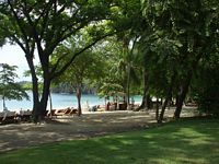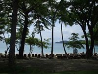 This morning after doing a few chores we headed ashore to do some exploring. We hiked up the hill towards the main road which runs along the ridge of the penisula and came across numerous birds, including a coupe of flycatchers with their dangling scissor tails. We got to the top and there was not a puff of wind so Robin tossed his thumb out and we scored a ride with the hotel minivan down to the resort area at the end of the penisula. Never known Robin to be too hot to walk somewhere. Anyway we immediately ordered water, beer, more water, another beer, another couple of waters and after rehydrating were finally able to contemplate some lunch. This place was also expensive, but we figured we could do it once. Just a normal hamburger was $17. Ouch. Prices in Costa Rica are definitely not what we´ve been used to. There were swimming pools we could have used but we opted for the beach and then caught the minivan back to hole ten of the golf course where we´d caught the first bus and hiked back down the extremely steep hill. Yestereday Robin had seen an enormous python snake but he wasn´t to be found today. We did however spy another group of monkeys which were quite different from the Spider and Howler Monkeys we´ve become accustomed to seeing. These had little black caps and white faces and until we find out the name of these cute little fellows, we´ve nicknamed them Yarmulkes, in honor of the jewish skullcaps they seem to be wearing. The entire penisula is home to the Four Seasons Residence Club and they have worked in golf courses, suites, private residences and still managed to keep a large chunk of the tropical vegetation. It seems to be very well integrated and the wildlife appears to be thriving. So far, Costa Rica really does seem to have a handle on integrating tourism with ecological issues.