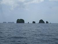 We crawled slowly around Punta Blanca then Cabo Santa Elena then sailed through the Murcielago Islands (Bat Islands), noticing how clear the conditions were. We could see for at least 20 miles, something we haven´t been able to do for eons. We would have stopped here at the islands except Robin couldn´t snorkel at the moment. The Murcielago´s are a group of rocks and small islands which extend about two miles paralleling the northern indent of Bahia Papagallo´s shore line. Unfortunately in the summer the swell comes from the south and protection is not so good. The snorkeling though is supposed to be among the best in Costa Rica and one of the beaches on the eastern side of the largest island is a nesting area for the Pacific Green Turtle. We´re kind of sorry to be missing it. Robin´s burns however are still not healed enough to be subjected to those harsh conditions.