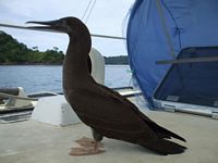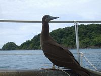 Snorkelled around the islet at the entrance to the westernmost point of the bay this morning. We identified two more eels, the Zebra Mooray and a Tiger Reef Eel. The center of the bay was probably more interesting in diversity but it was worth snorkelling around here just to see the eels. We have checked off over 3/4 of the fish in our fish identification book now. There are some like the deep sea fish which we will never see, otherwise we are quite chuffed at just how many weīve managed to spot. After lunch we had a booby come say hello. He went to land on the railing, missed and did an emergency crash landing on the deck. Once there he decided to take up residence and was not at all afraid of Robin, giving him a mouthful of cheek when he dared mention that maybe he should move on.