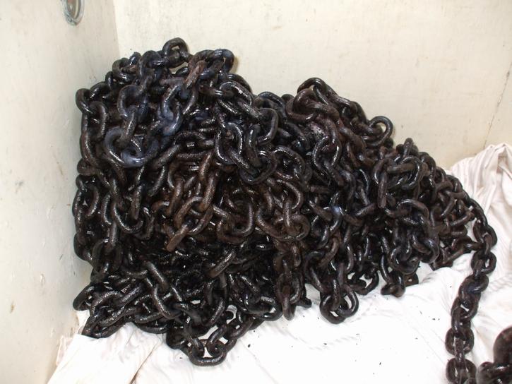 Thereīs no rest for the wicked. Today Robin started on the old rusty anchor chain. He has this new beaut stuff which turns rust into a hard coating in 20 minutes. Itīs called Casamar Rust Converter and after removing any oil, grease, dirt or wax residue, you just brush or dip the rusted surface and the reactive action converts the rust to a black acrylic hard protective coating. No more messy rusty spare chain laying in the bilge. Hopefully it will work.