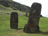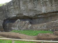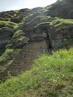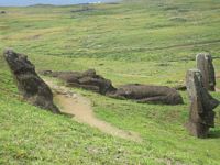 Next stop was Volcano Rano Raraku which was totally captivating. This was the quarry from which most of the islandīs moai were carved and here you can find, dotted across the southern slope of the volacano, moai in all stages of progress. There are dozens of sizes and styles; they are found in various poses, some partly buried with just their heads poking out, others still not quite detached from the tuff of which they are carved. The largest was 21m. The smallest around 2.5m. According to our trusty guidebook, this was the workshop and distribution center and all the moai were transported from here once finished. The trail around the site was 1500 meters long and we could have spent all afternoon just at this site.