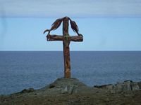 We headed back along the coast road towards the south end of the island knowing we had to make tracks now. The VHF radio had been blessedly silent so we knew all was well with the boat but we could see heavy cumulus approaching from the west and figured our hours were numbered. We made a few stops along the way, checking out more toppled moai, a few Ahus, the rugged coastline and a pretty neat cross. We took a short cut via a dirt track around the back of the airport and connected with the road that would lead us up to the top of Rano Kau, the last area we would be exploring today.