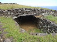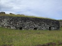 400 meters above the crater, perched on the southern edge with a vertical drop plunging vertiginously to the ocean, was the Orongo Ceremonial Village. This village was comprised of 54 houses, and is dated at around the XVI century. The information boards at the site stated that by the 18th and 19th century, the island society was leaving megalithism, the moai we had been looking at all day, and had replaced it with the cult of the Makemake god, the religion itself drawn from spring celebration, fertility and migratory sea-birds. Birdman petroglyphs are visible on a cluster of boulders. The houses themselves were constructed of small stone slabs, layed horizontally on top of each other, with an earth-covered arched roof of similar slabs. This made them appear partly subterranean. We are not certain weather the doorways really were as small as they appeared or weather the houses have been silted in. The flagstones were quarried from the rock found at the top of the crater.