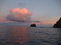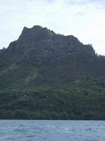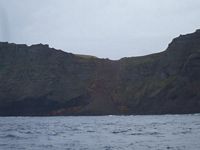 Of course it wasnīt so rough that we were going to miss out on cruising the south part of the island so we bashed our way down the couple of miles to the bottom of the island then took a left and had a breathtaking, less than 250 meters up close and personal, sail off the pinnacle rock of Motu Iti. To the left of us was the backside of Rana Kau crater lagoon complete with landside. We were wondering how long before the lagoon lake busts out.