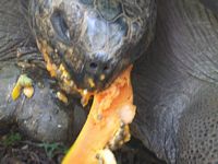 Next we made a pit stop to say Gīday to Mrs T, the islands sole remaining Galapagos tortoise. For a long time they thought she was a male and so called her Mr. T. Now she is Mrs T or Misty as it turns out she was really a gal. Sheīs about 70 years old now. She certainly made a pig of herself chomping into bananas and papaya. She lives on the banana plantation and bananas are a major part of her diet.