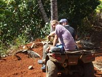 Brenda called us up around 9:30 in the morning and got us moving towards shore. We finally managed to arrive around 10:45am. We were greeted by a number of Pitcairners who had come down to the dock to welcome us and amongst them was David who had kept us company on the Ham Radio over the last 13 days of our journey. It was wonderful to put a face to the voice. After completing all the introductions and filling out the necessary forms for customs we headed by buggy bike back to Brenda and her husband, Mikeīs place where she finished stamping our passports. There were a lot of people there, too many to remember and we sat around eating fresh papaya and drinking cups of tea for about an hour, exchanging chit chat. Next up Brenda and Mike decided we needed to see the island, so back on the dune buggy bikes went we and off we headed for a tour of the island.